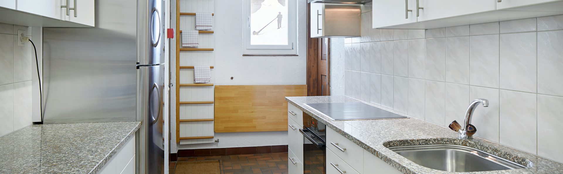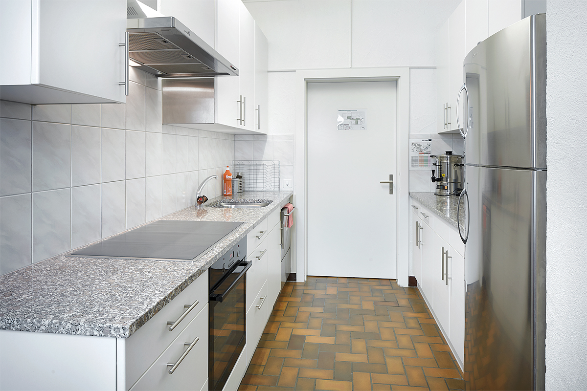 Die Küche im Hausteil Horn im Erdgeschoss hat ein 4er Cerankochfeld (60 x 80), ist modern ausgerüstet mit einem Umluftofen und einem grossen Kühlschrank mit integriertem Gefrierfach. Die Küche hat einen grossen Heisswasserautomat für gemahlenen Kaffee. Handtücher, Schwämme, Abwaschmittel stellen wir zur Verfügung.