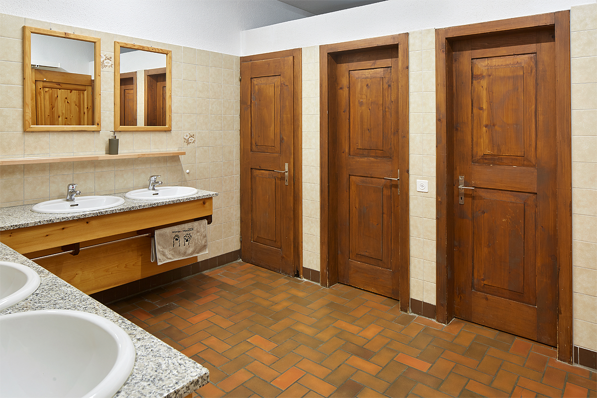 Im Haus gibt es eine grosse Nasszelle mit separaten WC’s und Einzelduschkabinen. Das Leiterzimmer Stäfeli verfügt über ein separate Dusche und WC.