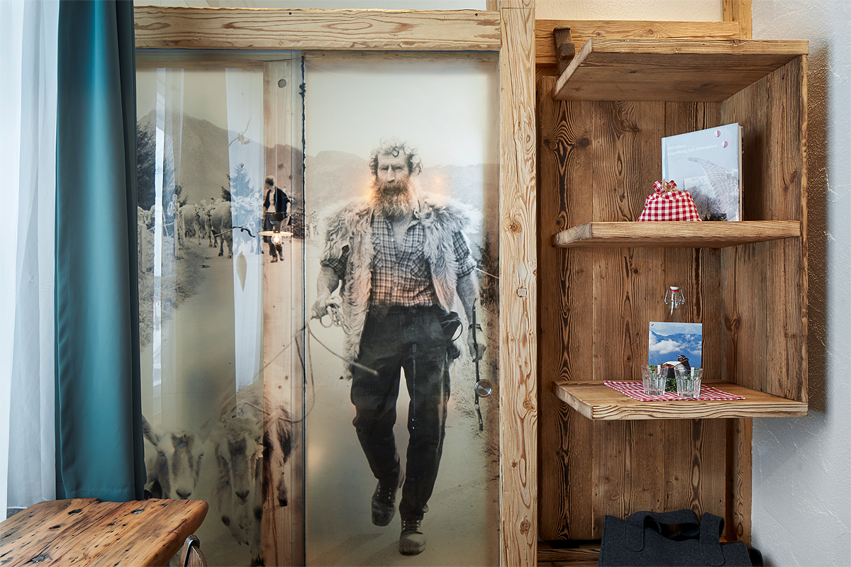 Das Leiterzimmer Stäfeli mit kleinem Badezimmer mit Dusche/WC verfügt über Daunenbettwäsche.
