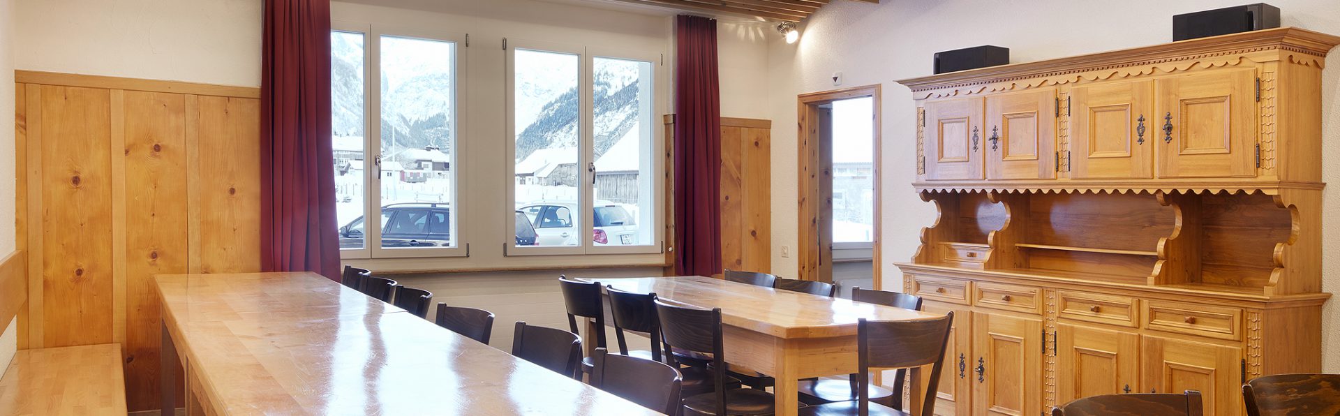 Der kleinere, helle Aufenthaltsraum Horn im Erdgeschoss ist zirka 30m2 gross. 32 Personen finden hier einen Sitzplatz. Dieser Raum verfügt über CD-Player und Radio.